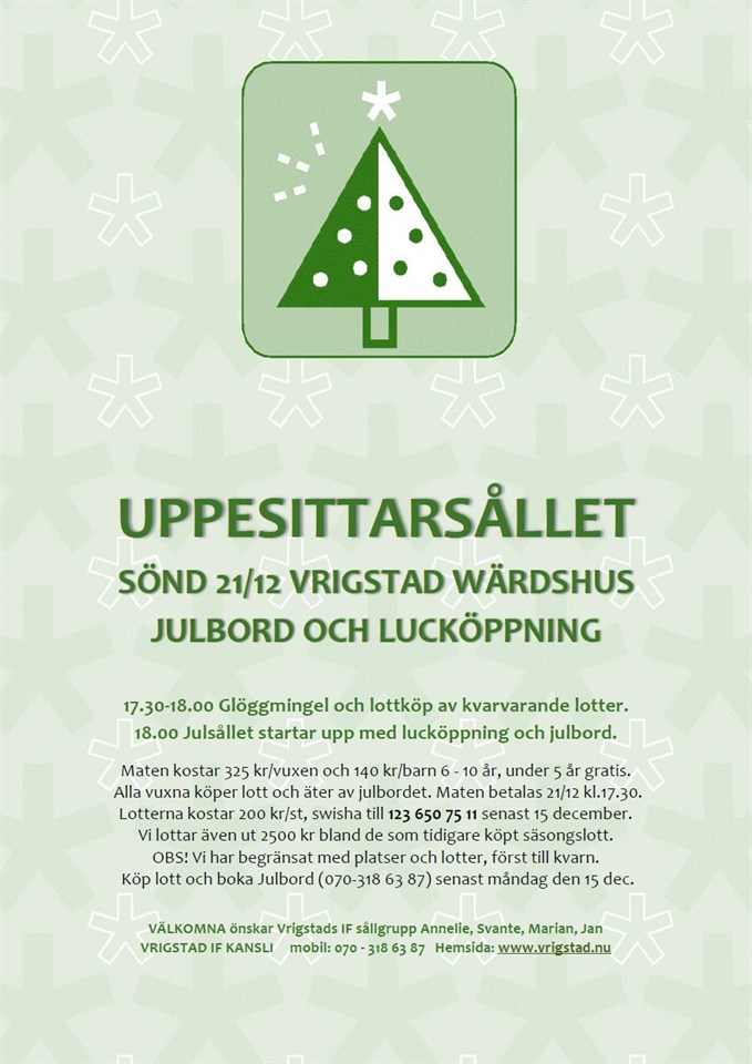 | Lotteri-Eventgrupp Uppesittarsållet dragning med julbuffé | 21 dec, 18:00 |