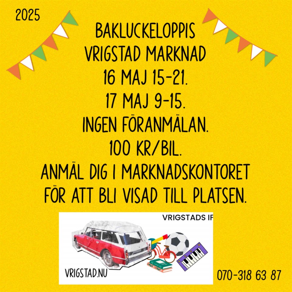 Äntligen dags för årets Vrigstad Marknad. Fredag 15.00-21.00 Lördag 9.00-15.00 På årets marknad har vi 100 knallar, tivoli, mat och fika, lotteri,halva potten, bakluckeloppis, Sydskyttarna finns på plats på lördag som vanligt med ponnyridning, prova bågskytte, Vrigstads IF discgolf erbjuder testa på discgolf. På scenen har vi bl.a Trubadur Thomas Johansson från Göteborg på fredag kväll och på lördag sjunger 13-åriga Felicia Lundkvist, det blir Vinnarsållet, dragning av halva potten. Det kommer bli 2 härliga dagar med något som passar alla. Varmt välkomna hälsar Vrigstads IF MARKNADSSEKTION, Fredrik Bodefält, Niclas Classon, Bengt Swerlander, Svante Stenervik, Annelie Olofsson.