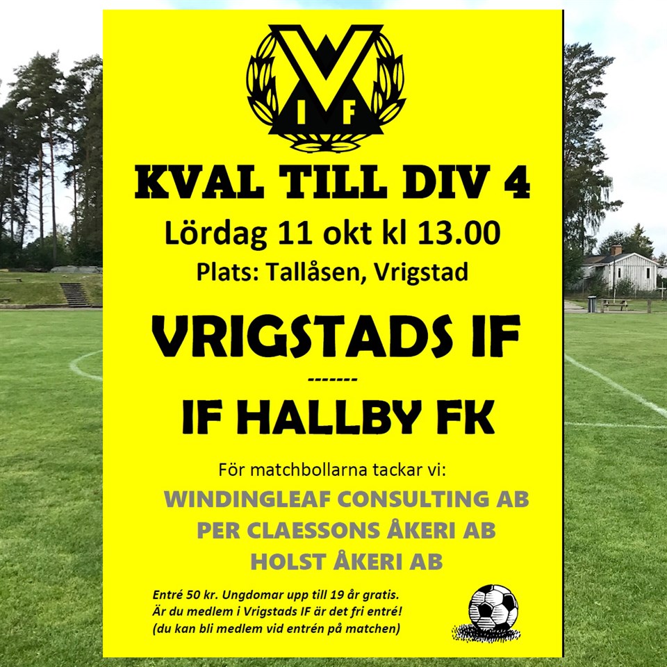 På lördag är det kvalmatch på Tallåsen. VIF möter IF Hallby FK på Tallåsen lördag 11 oktober kl 13.00. 2 till kvalmatcher ska spelas i Unnaryd och Norrahammar men först i Vrigstad. Kom och ge ditt stöd till våra gulsvarta killar. Varmt välkomna! Vrigstads IF 9 okt 0kommentarer