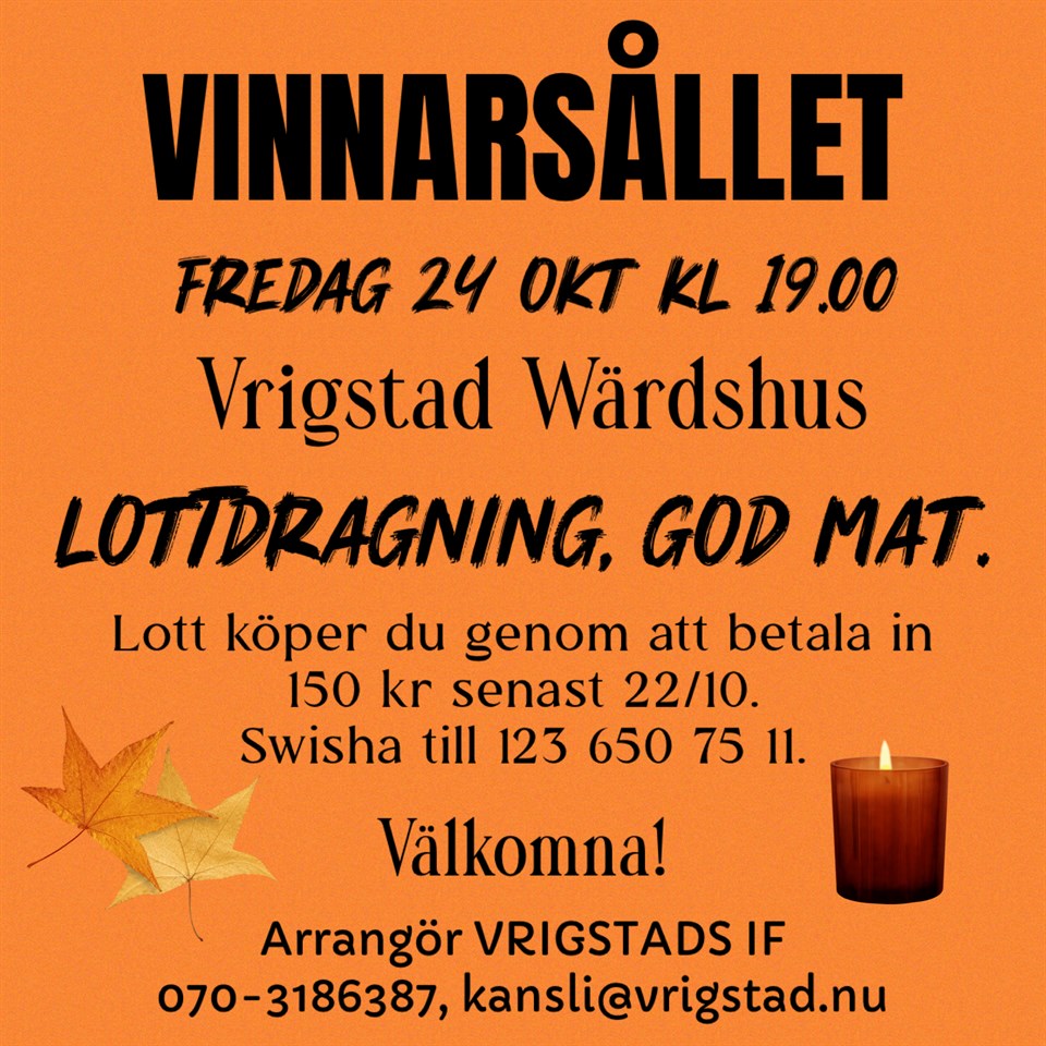 Nu är det dags att boka in höstmys med vinnarsållets dragning och god mat o dryck. fredag 24 oktober. Välkommen att boka din lott senast 22/10. Maten behöver ej bokas i förväg du betalar maten när du kommer kl 19.00. Alla varmt välkomna! Vrigstads IF 15 okt 0kommentarer