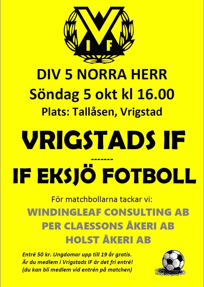 Välkomna på sista seriematchen för Herr A div 5, 1an möter 2an. Men sen väntar kvalmatcher för Vrigstad, 3 matcher i oktober. Vi återkommer när matchtiderna är lagda. Men först ses vi på Tallåsen på söndag. Vrigstads IF 2 okt 0kommentarer