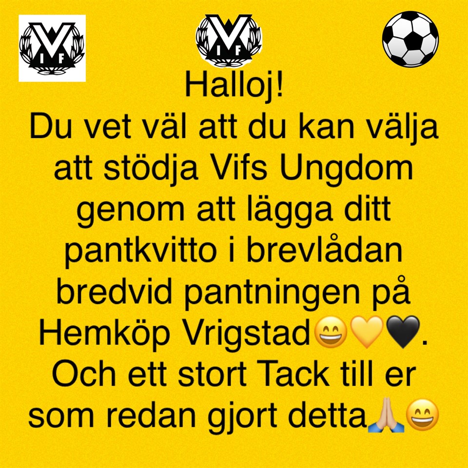 Halloj! Du vet väl att du kan välja att stödja Vifs Ungdom genom att lägga ditt pantkvitto i brevlådan bredvid pantningen på Hemköp Vrigstad😄💛. Och ett stort Tack till er som redan gjort detta🙏😄 Vrigstads IF 15 feb 2023 0kommentarer