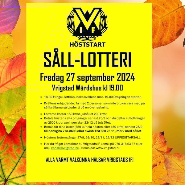 • Betala för dina lotter (650 kr/hela hösten eller 150 kr/st) senast 25/9 till bankgiro 278-8693 eller swish 123 650 75 11, märk med sållet.