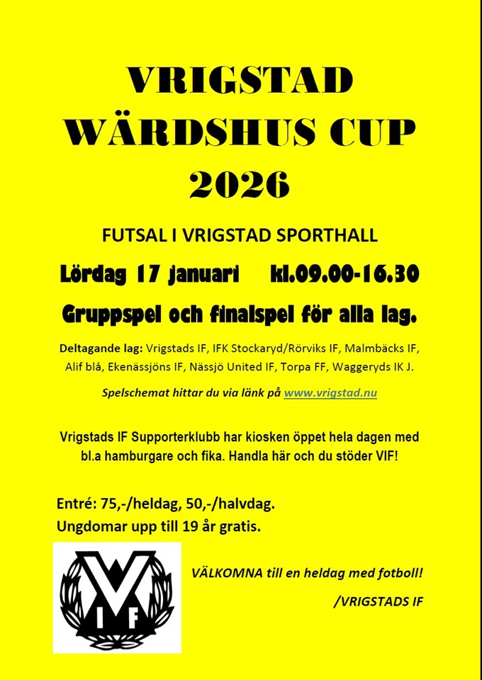 VRIGSTAD WÄRDSHUS CUP 2026 FUTSAL I VRIGSTAD SPORTHALL Lördag 17 januari kl.09.00-16.30 Gruppspel och finalspel för alla lag. Deltagande lag: Vrigstads IF, IFK Stockaryd/Rörviks IF, Malmbäcks IF, Alif blå, Ekenässjöns IF, Nässjö United IF, Torpa FF, Waggeryds IK J. Spelschemat hittar du via länk på www.vrigstad.nu Vrigstads IF Supporterklubb har kiosken öppet hela dagen med bl.a hamburgare och fika. Handla här och du stöder VIF! Entré: 75,-/heldag, 50,-/halvdag. Ungdomar upp till 19 år gratis. VÄLKOMNA till en heldag med fotboll! /VRIGSTADS IF
