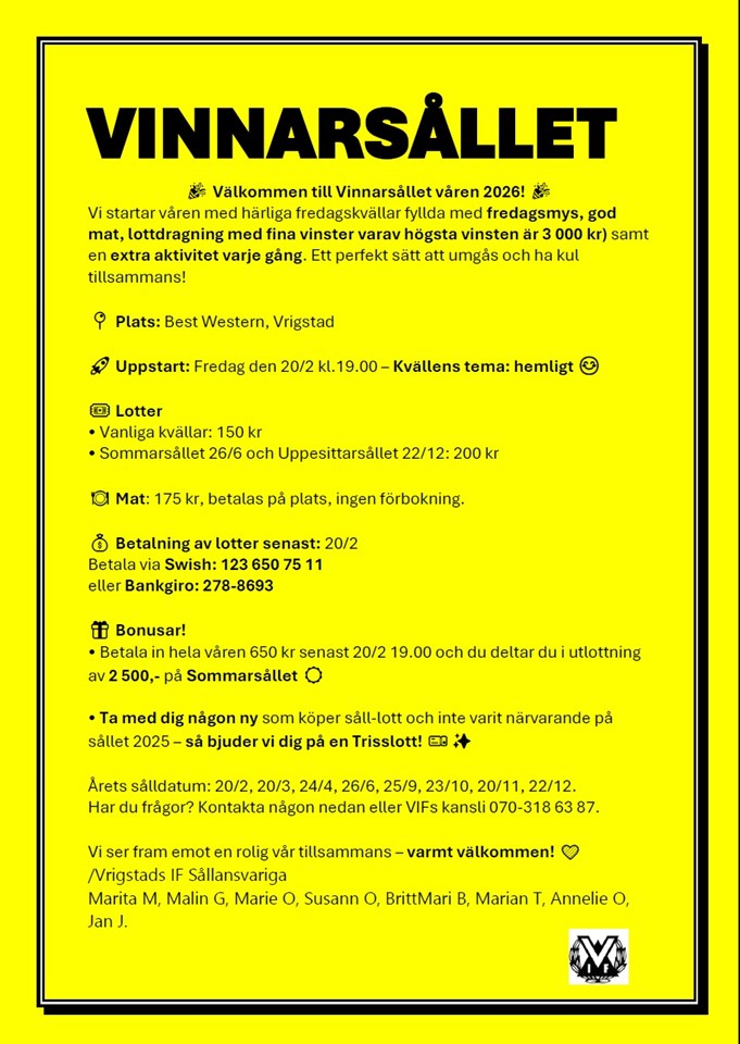 VINNARSÅLLET 🎉 Välkommen till Vinnarsållet våren 2026! 🎉 Vi startar våren med härliga fredagskvällar fyllda med fredagsmys, god mat, lottdragning med fina vinster varav högsta vinsten är 3 000 kr) samt en extra aktivitet varje gång. Ett perfekt sätt att umgås och ha kul tillsammans! 📍 Plats: Best Western, Vrigstad 🚀 Uppstart: Fredag den 20/2 kl.19.00 – Kvällens tema: hemligt 😊 Lotter • Vanliga kvällar: 150 kr • Sommarsållet 26/6 och Uppesittarsållet 22/12: 200 kr Mat: 175 kr, betalas på plats, ingen förbokning. 💰 Betalning av lotter senast: 20/2 Betala via Swish: 123 650 75 11 eller Bankgiro: 278-8693 🎁 Bonusar! • Betala in hela våren 650 kr senast 20/2 19.00 och du deltar du i utlottning av 2 500,- på Sommarsållet ☀ • Ta med dig någon ny som köper såll-lott och inte varit närvarande på sållet 2025 – så bjuder vi dig på en Trisslott! 🎫? Årets sålldatum: 20/2, 20/3, 24/4, 26/6, 25/9, 23/10, 20/11, 22/12. Har du frågor? Kontakta någon nedan eller VIFs kansli 070-318 63 87. Vi ser fram emot en rolig vår tillsammans – varmt välkommen! 💛 /Vrigstads IF Sållansvariga Marita M, Malin G, Marie O, Susann O, BrittMarie B, Marian T, Annelie O, Jan J.
